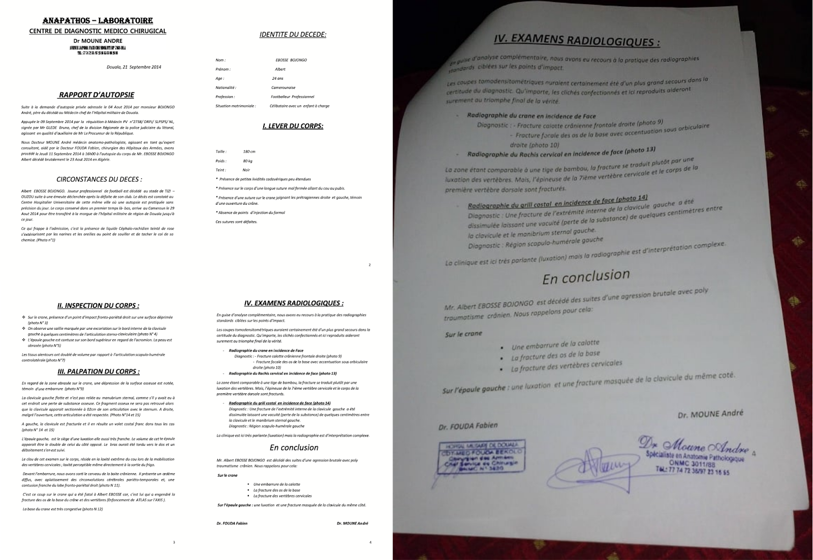 أُجري تشريح جثة ألبرت إيبوسي يوم الخميس 11 سبتمبر 2014، الساعة الرابعة مساءً، في المستشفى العسكري الإقليمي بمدينة دوالا، على يد الدكتورين أندريه مونيه وفابيان فودا. التقرير كشف عن سلسلة من الإصابات العنيفة والمركّزة، لا يمكن بأي حال من الأحوال أن تكون ناتجة عن حجر أو قطعة أردواز كما زعمت الرواية الرسمية: