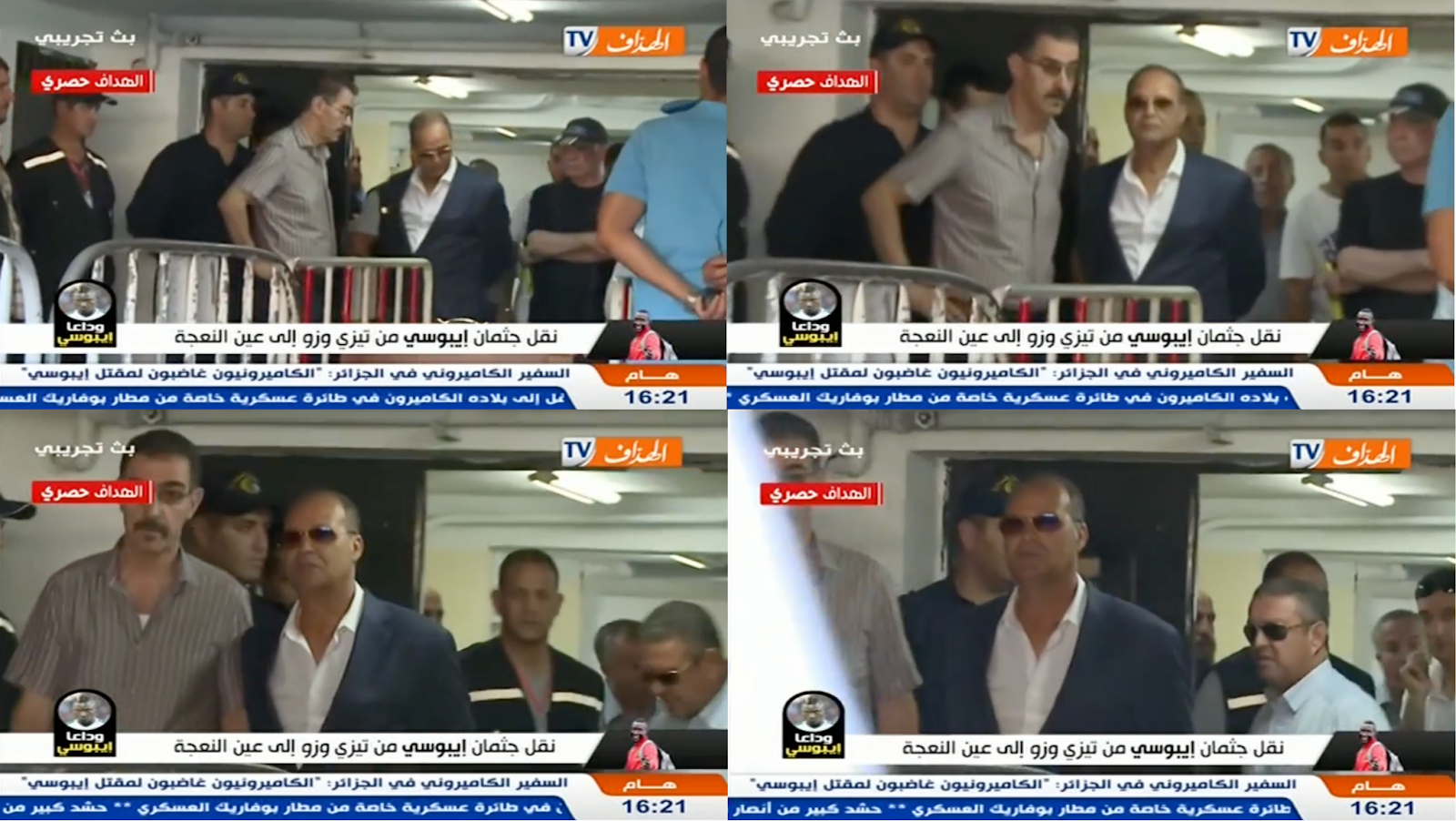 جثمان إيبوسي في مطار دوالا، ويظهر السفير الجزائري في الكاميرون توفيق ميلات — 29 أغسطس 2014.