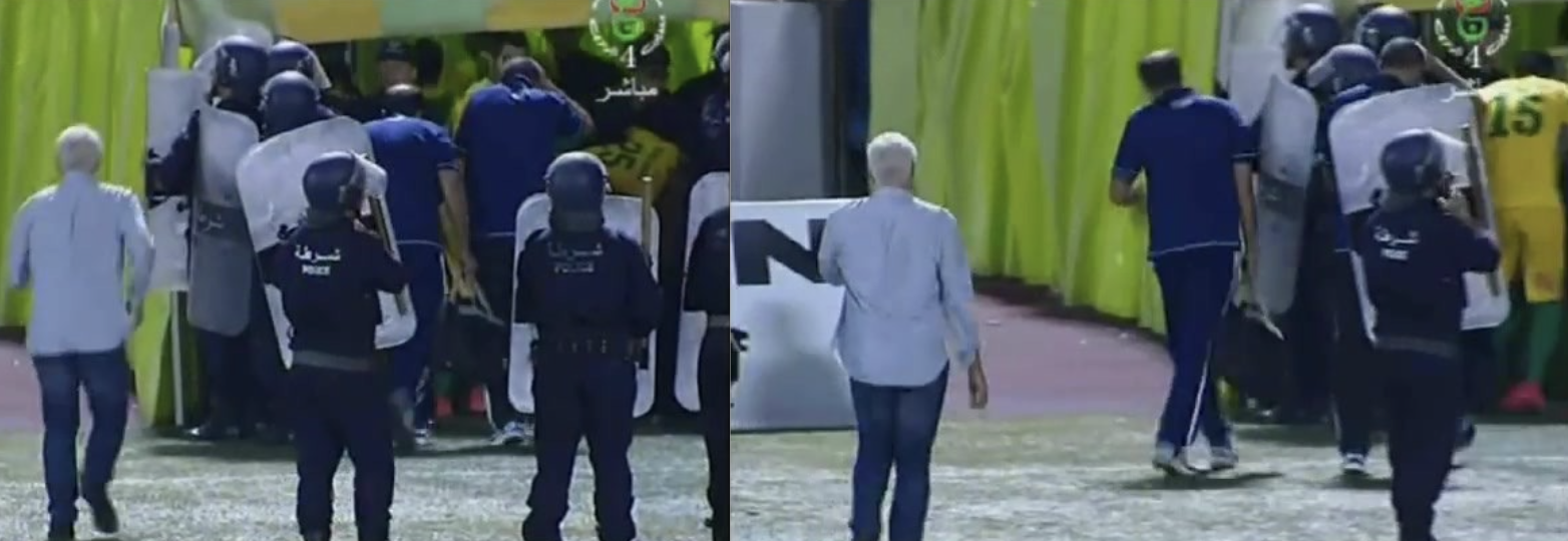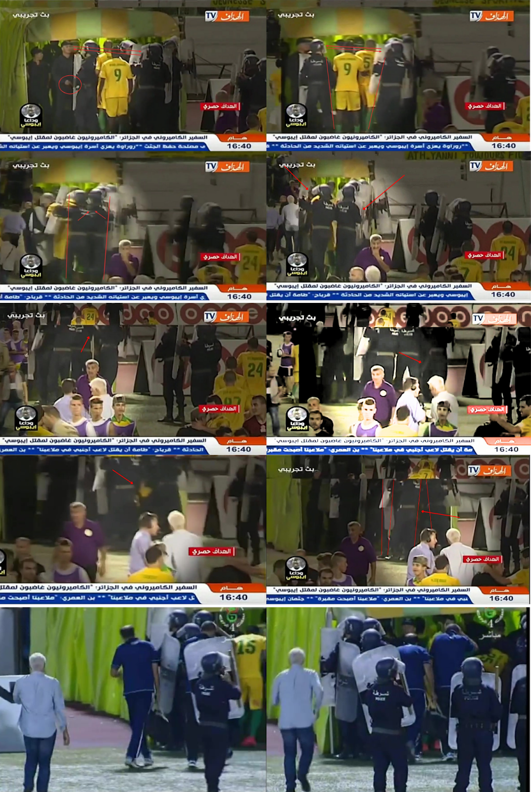 لكن كاميرات “الهداف TV” والتلفزيون الجزائري الرسمي ENTV كانت تصوّر مباشرة داخل النفق. ويُظهر التسجيل لحظة سقوط إيبوسي محاطًا بعناصر مكافحة الشغب.
