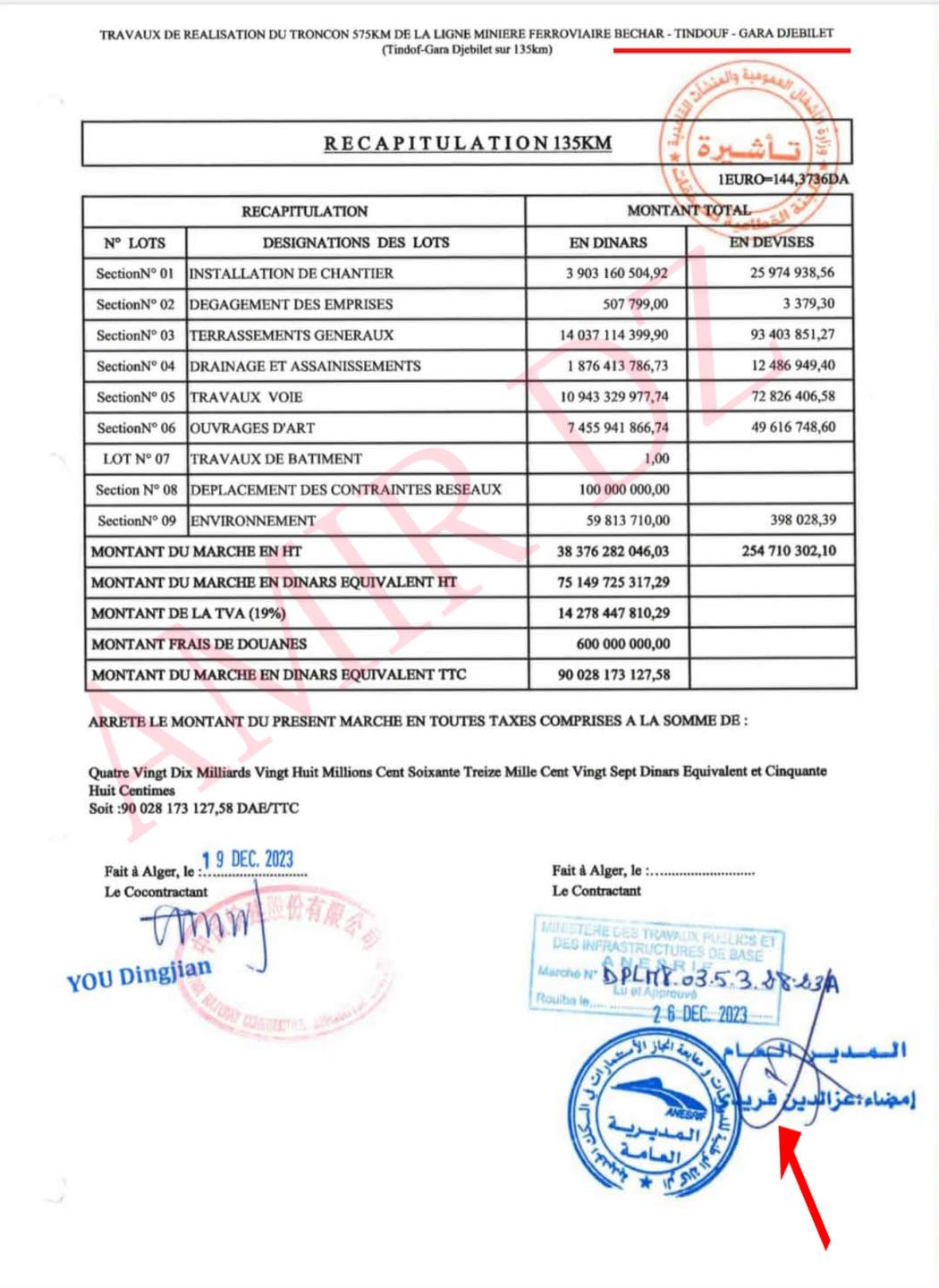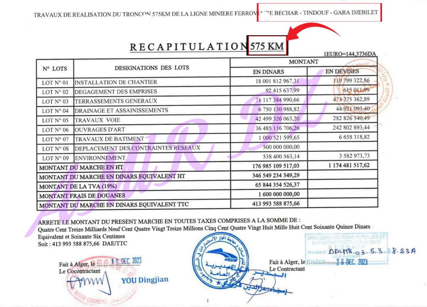 يخصص العقد 3.9 مليار دينار، أي نحو 27 مليون يورو، لبند مالي واحد: تهيئة الورشة. عادةً تفصل ميزانيات البناء النفقات: تكلفة المتر المربع من السياج، تكلفة كل وحدة مسبقة الصنع، وتكلفة ساعة العمل. هذا العقد يصنف الحصة رقم 1 كمبلغ مقطوع شامل.