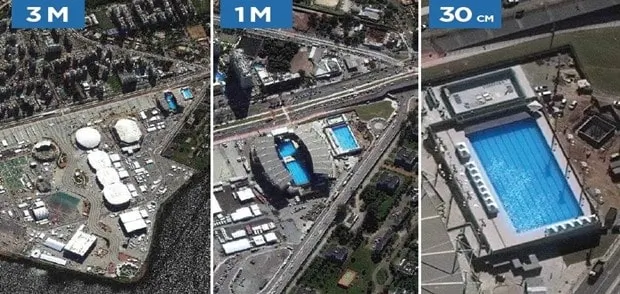 عند مقارنة نفس المنطقة بثلاث درجات من الدقة الفضائية، يتضح الفارق بجلاء. عند 3 أمتار تختلط الأشكال وتتحول إلى كتل غير واضحة. عند متر واحد يمكن تمييز البنى الكبرى دون تفاصيل قابلة للاستغلال. أما عند 30 سنتيمترا فتُصبح المركبات والمعدات والاستخدامات الدقيقة واضحة تماما. هذه المقارنة تبرز حدود قمر بدقة 2.5 متر مثل ALSAT-3A: يصلح للخرائط العامة وتخطيط الأراضي، لكنه غير صالح للاستخبارات العسكرية التكتيكية ولا للمراقبة في الزمن الحقيقي.