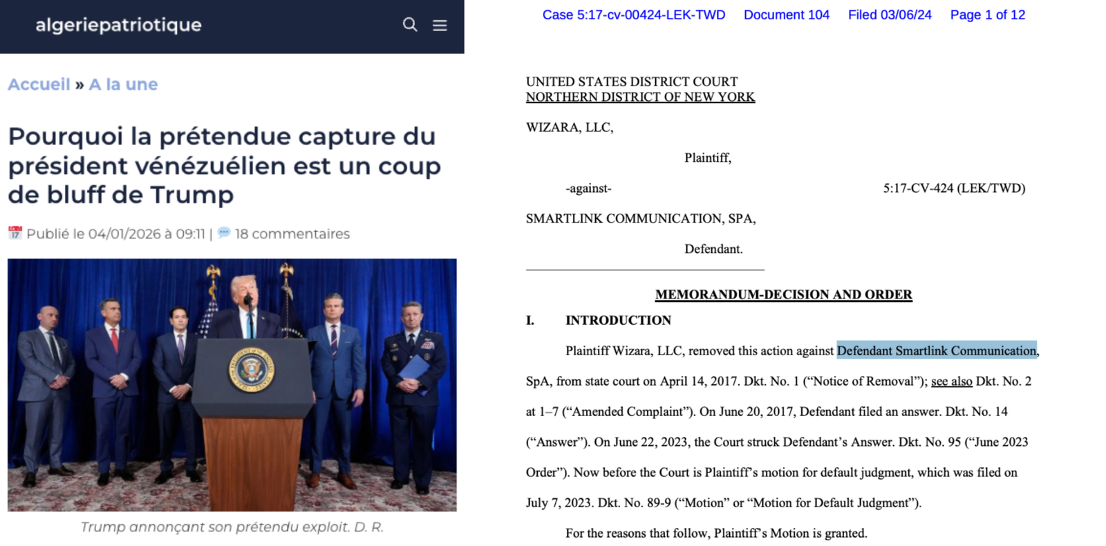L’ironie est que Lotfi Nezzar provoque l’administration américaine alors même qu’un jugement fédéral, le 5:17-CV-424 (LEK/TWD) du District Nord de New York, pend au-dessus de sa tête comme une épée de Damoclès.