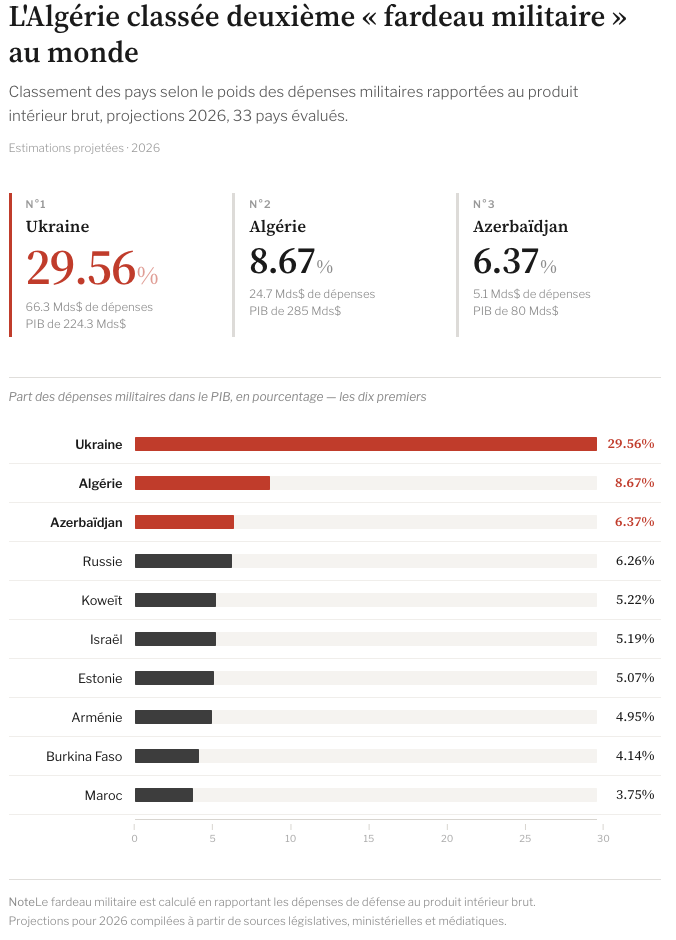 L’Algérie se classe au deuxième rang mondial en matière de « fardeau militaire », c’est-à-dire parmi les pays qui allouent la plus grande proportion de leur richesse nationale aux dépenses de défense, juste derrière l’Ukraine. Autrement dit, l’armée algérienne est la deuxième la plus coûteuse pour sa population au monde, et le pays n’est en guerre contre personne.