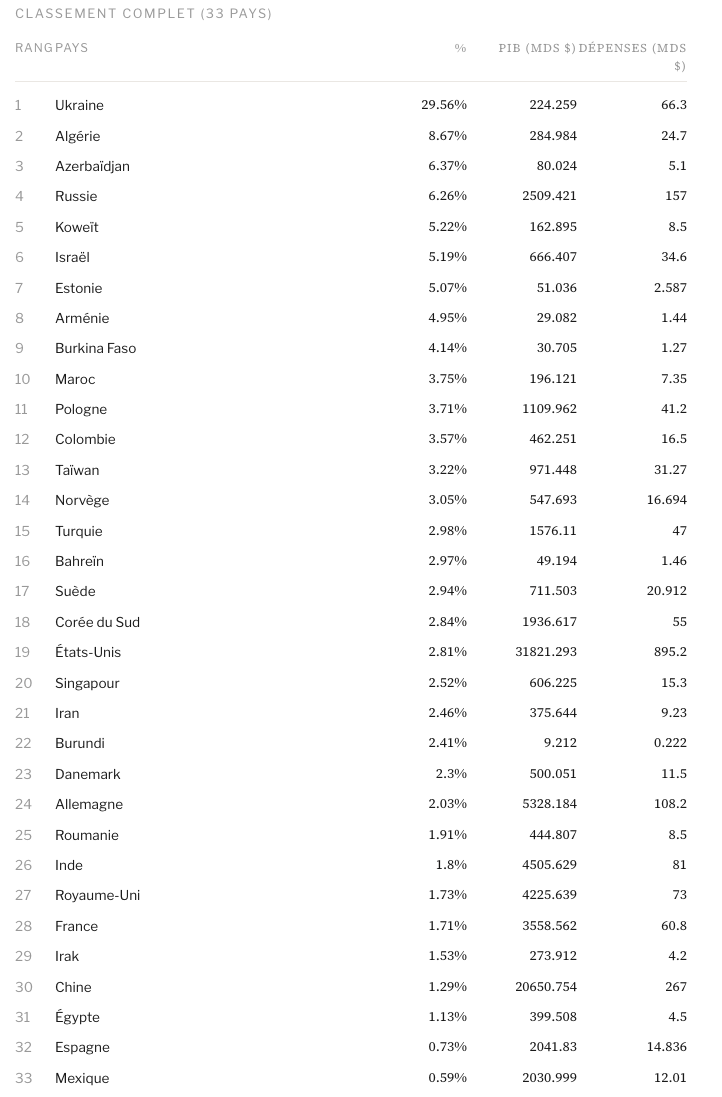- Note de méthodologie : Nous avons fusionné les 50 premiers pays par dépense militaire absolue (SIPRI 2024) et les 30 premiers par charge militaire (Banque mondiale 2024), obtenant une liste de 57 États couvrant la quasi-totalité des dépenses militaires mondiales. Pour chacun, nous avons extrait manuellement les budgets de défense 2026 à partir des lois de finances nationales ou publications gouvernementales officielles, puis calculé le ratio en les rapportant aux projections de PIB nominal 2026 du FMI. Nos projections étant fondées sur les lois de finances adoptées et les estimations macroéconomiques disponibles en février 2026, le classement définitif ne sera connu qu’au cours de l’année prochaine, lors de la publication des données consolidées, ce qui confère toute sa valeur prospective et analytique à notre démarche. ↑