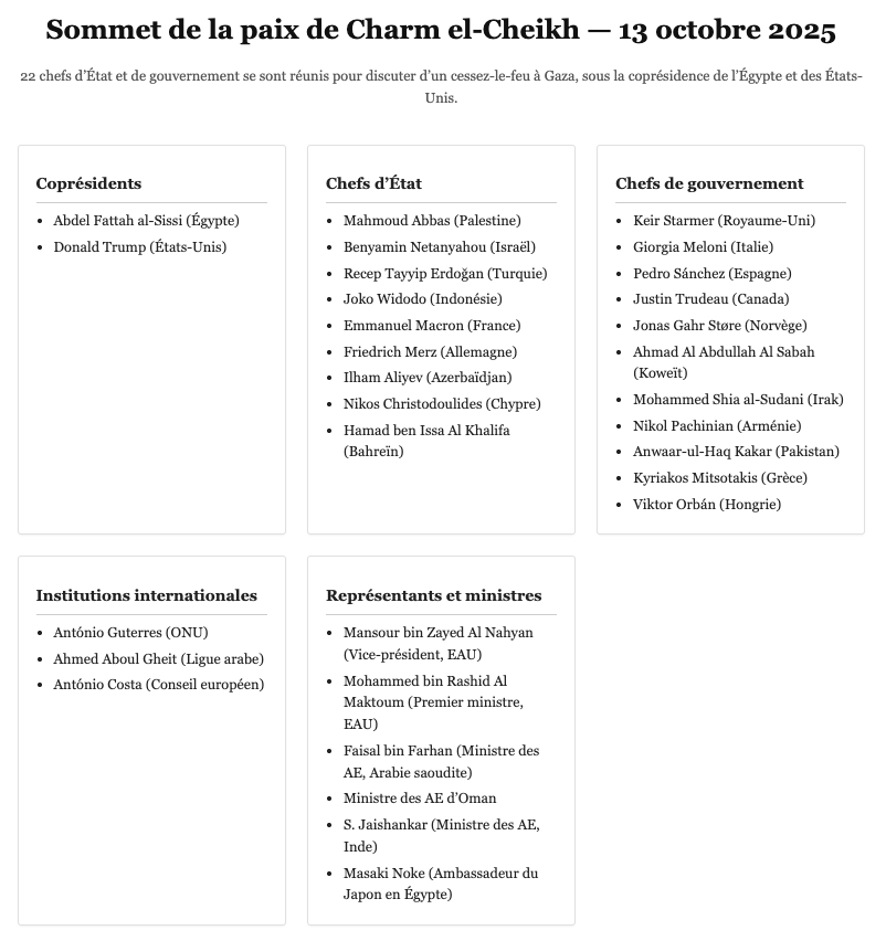 Plus de vingt-deux chefs d’État et de gouvernement se sont réunis au Sommet de la paix de Charm el-Cheikh le 13 octobre 2025, pour sceller la fin de la guerre à Gaza et lancer une nouvelle phase au Moyent-Orient. Le sommet visait à finaliser le plan de cessez-le-feu, la libération des otages, et la mise en place d’une autorité de transition à Gaza sans le Hamas.